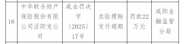 国家金融监督管理总局网站今日公布的咸阳监管分局行政处罚信息公示表(咸金罚决字〔2025〕17号)显示,中华联合财产保险股份有限公司泾阳支公司农险理赔支付超期。咸阳金融监管分局对其罚款22万元。
