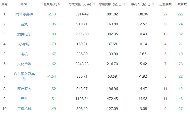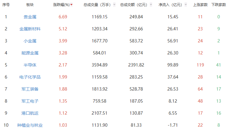 板块方面,贵金属、金属新材料、小金属等板块涨幅居前,汽车零部件、游戏、消费电子等板块跌幅居前。