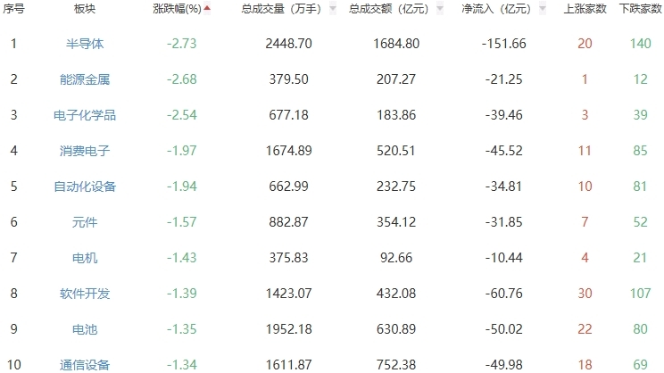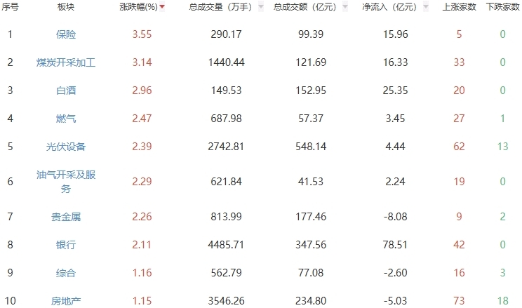 板块方面,保险、煤炭开采加工、白酒等板块涨幅居前,半导体、能源金属、电子化学品等板块跌幅居前。