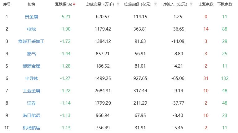 板块方面,工程机械、风电设备、房地产、油气开采及服务等涨幅居前,贵金属、电池、煤炭开采加工、燃气等跌幅居前。