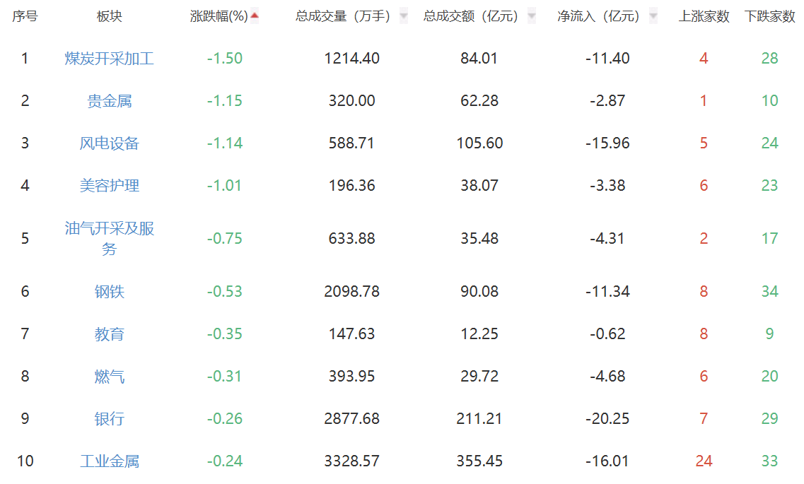 行业板块方面,电池、非金属材料、元件等板块涨幅居前,煤炭开采加工、贵金属、风电设备等板块下跌。