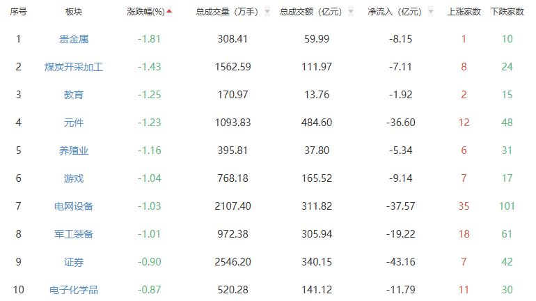 板块方面,能源金属、电池、钢铁等板块涨幅居前,贵金属、煤炭开采加工、教育等板块跌幅居前。