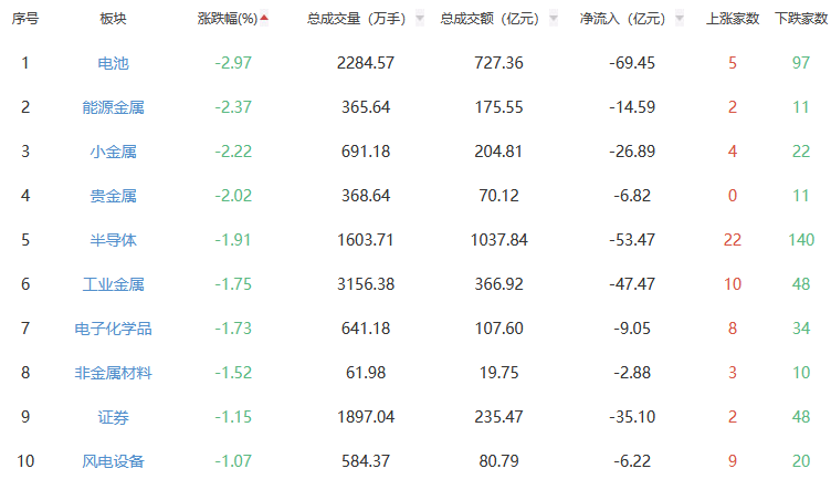 行业板块方面,油气开采及服务、种植业与林业、煤炭开采加工等板块涨幅居前,电池、能源金属、小金属等板块跌幅居前。