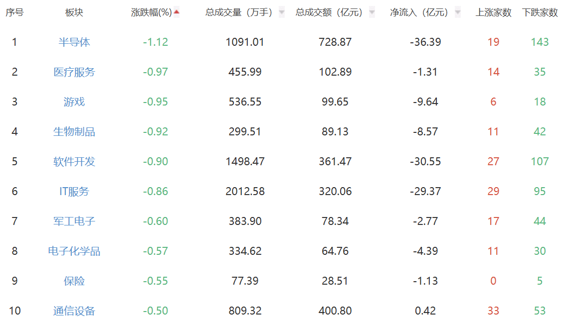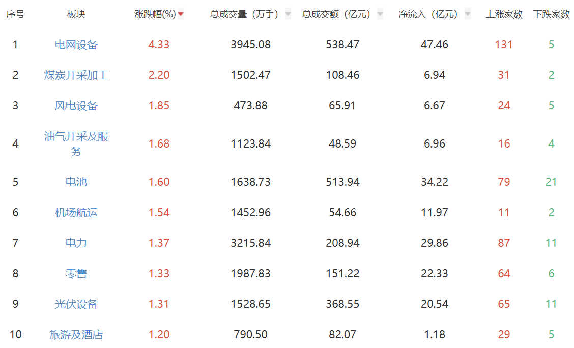 板块方面,电网设备、煤炭开采加工、风电设备等板块涨幅居前,半导体、医疗服务、游戏等板块跌幅居前。
