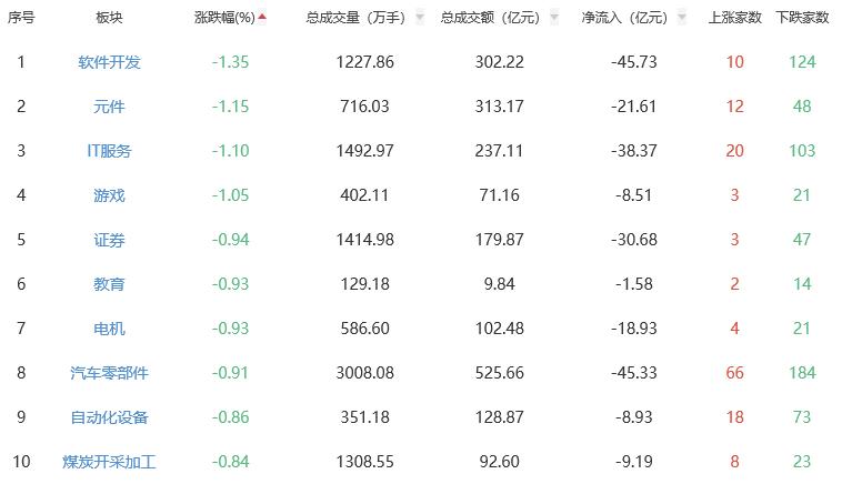 板块方面,化学原料、农化制品、电池、化学制品等涨幅居前,软件开发、元件、IT服务、游戏等跌幅居前。