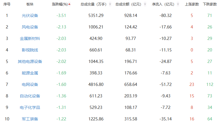 行业板块方面,保险、医药商业、油气开采及服务等板块涨幅居前,光伏设备、风电设备、金属新材料等板块跌幅居前。