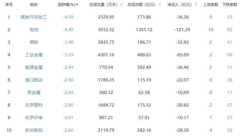 板块方面,互联网电商、文化传媒、IT服务、教育等涨幅居前,煤炭开采加工、电池、钢铁、工业金属等跌幅居前。