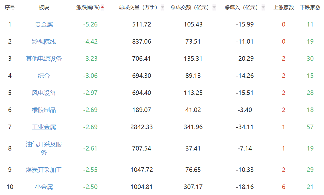 板块方面,零售、教育、食品加工制造等板块涨幅居前,贵金属、影视院线、其他电源设备等板块跌幅居前。