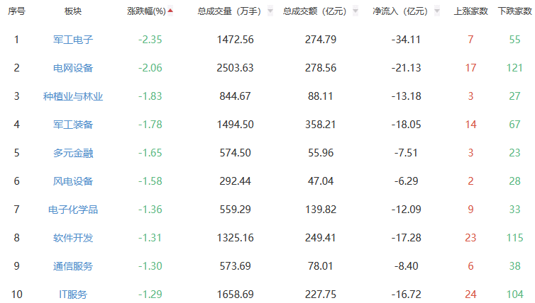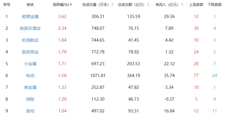 行业板块方面,能源金属、旅游及酒店、机场航运等板块涨幅居前,军工电子、电网设备、种植业与林业等板块跌幅居前。