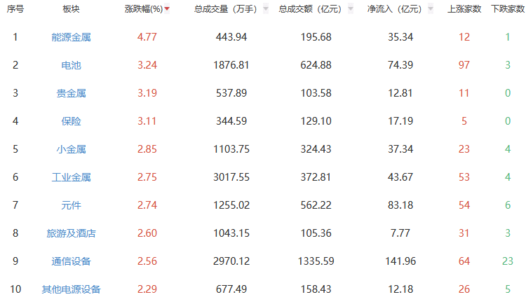 行业板块方面,能源金属、电池、贵金属等板块涨幅居前,种植业与林业、军工电子、白酒等板块跌幅居前。