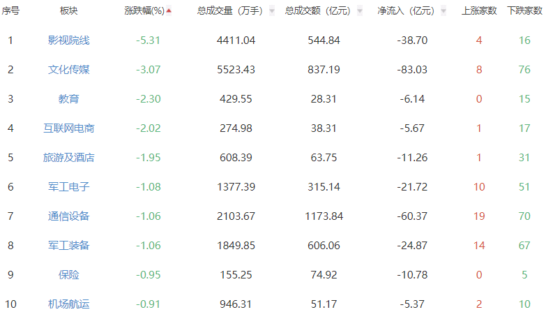板块方面,小金属、能源金属、油气开采及服务等板块涨幅居前,影视院线、文化传媒、教育等板块跌幅居前。