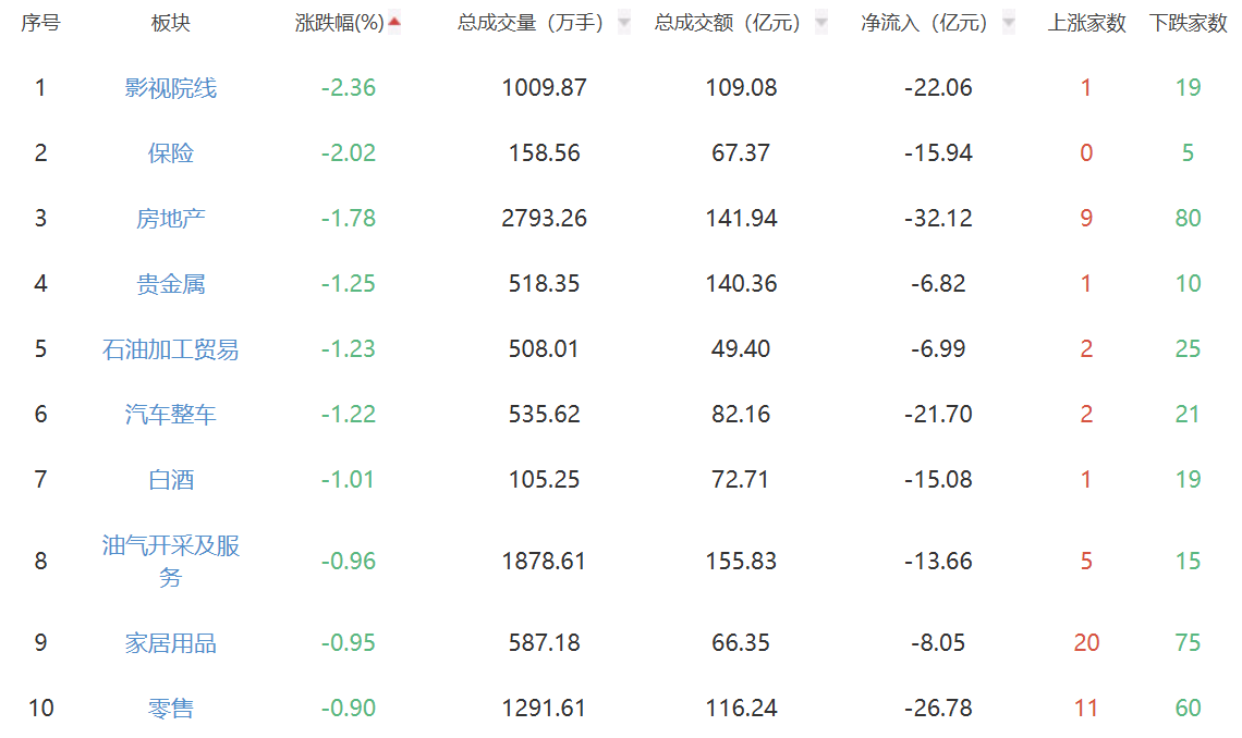 板块方面,元件、风电设备、通信设备等板块涨幅居前,影视院线、保险、房地产等板块跌幅居前。