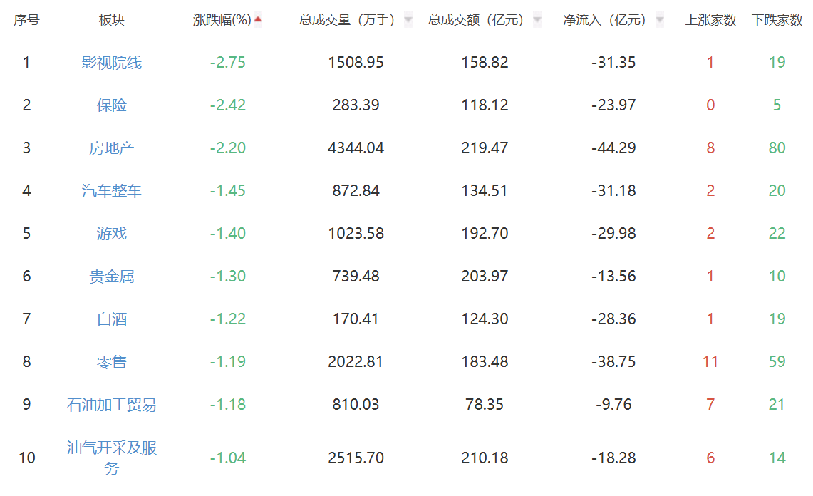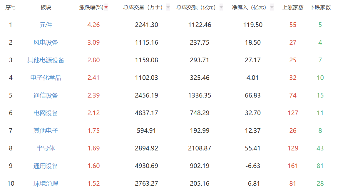 板块方面,元件、风电设备、其他电源设备等板块涨幅居前,影视院线、保险、房地产等板块跌幅居前。