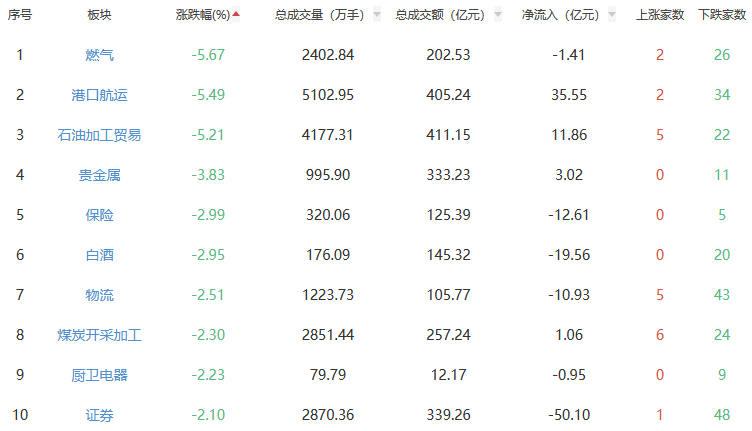 行业板块方面,电网设备、种植业与林业、军工装备等板块涨幅居前,燃气、港口航运、石油加工贸易等板块跌幅居前。