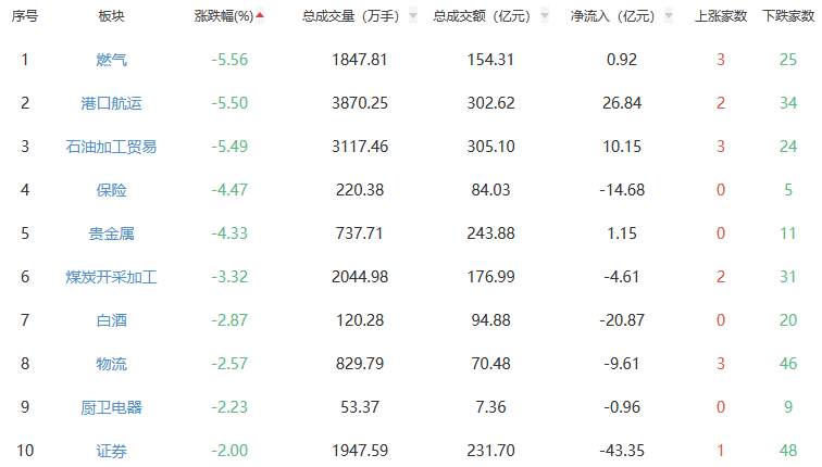 行业板块方面,种植业与林业、电网设备、军工装备等板块涨幅居前,燃气、港口航运、石油加工贸易等板块跌幅居前。