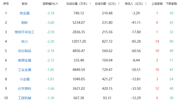 板块方面,元件、其他电子、半导体等板块涨幅居前,贵金属、钢铁、煤炭开采加工等板块跌幅居前。