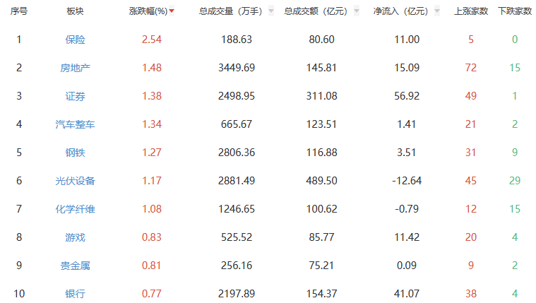 行业板块方面,保险、房地产、证券等板块涨幅居前,油气开采及服务、电子化学品、通信设备等板块跌幅居前。