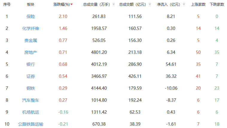 行业板块方面,保险、化学纤维、贵金属等板块涨幅居前,通信设备、电子化学品、元件等板块跌幅居前。