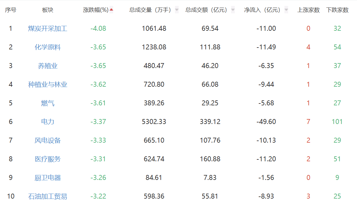 板块方面,通信设备、电子化学品、医药商业等板块涨幅居前,煤炭开采加工、化学原料、养殖业等板块跌幅居前。