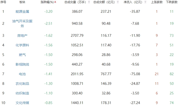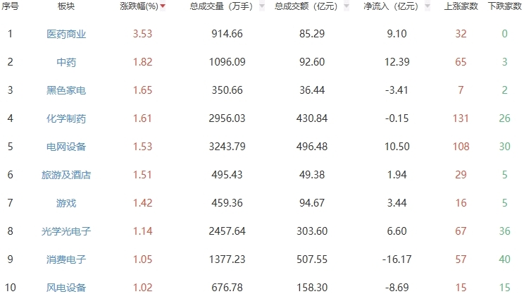 板块方面,医药商业、中药、黑色家电等板块涨幅居前,能源金属、油气开采及服务、房地产等板块跌幅居前。