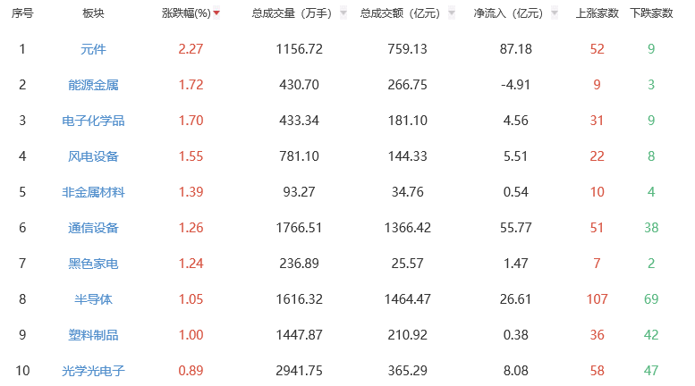 板块方面,元件、能源金属、电子化学品等板块涨幅居前,旅游及酒店、厨卫电器、医疗服务等板块跌幅居前。
