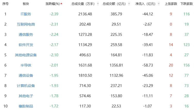 板块方面,电子化学品、煤炭开采加工、电力等涨幅居前,IT服务、互联网电商、通信服务等跌幅居前。