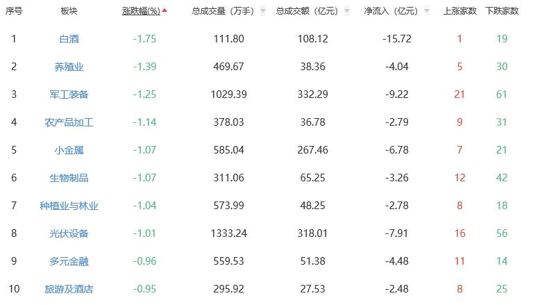 板块方面,电子化学品、半导体、元件等涨幅居前,白酒、养殖业、军工装备等跌幅居前。
