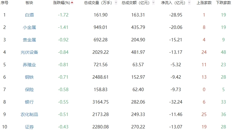 板块方面,半导体、电子化学品、元件等板块涨幅居前,白酒、小金属、贵金属等板块跌幅居前。