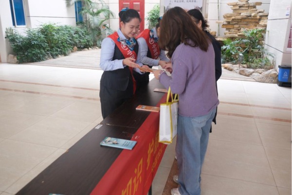 讲座结束后,宣讲团队来到老年大学一楼大厅宣传展台,向过往的老年大学学员们和教职工分发宣传折页,方便老年朋友们随时翻阅学习,并一对一为学员们答疑解惑。