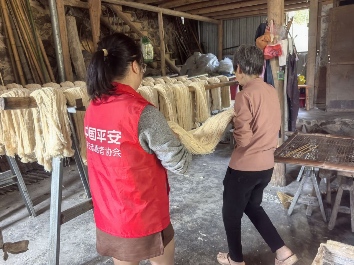 农时不等人,手艺亦需争分夺秒。面对“田间忙”与“作坊紧”的双重压力,手工米粉若不及时摊晒,便是一季的辛劳付诸东流。这天,平安志愿者没有止步于旁观,而是俯下身子,协助梳理粉线、抢时晾晒。这一双双援手,不仅保住了老人的生计,更让阿婆能安心奔赴田间,解决了心头大难事。